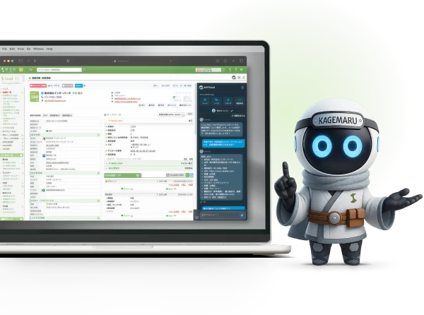 サスケに登録されているリードデータや活動履歴などを基にAIアシスタント「カゲマル」が最適なタイミングに最適なアクション方法をお知らせします。