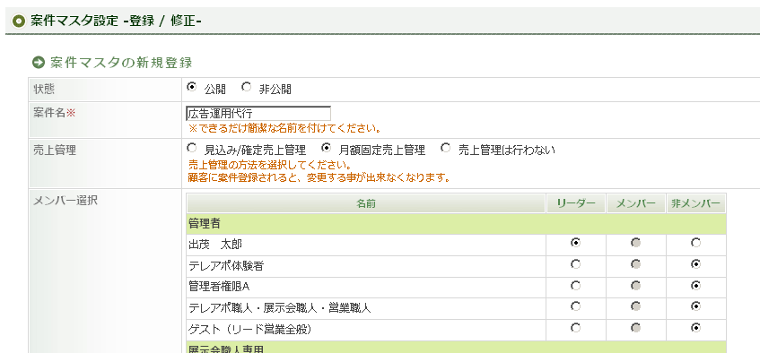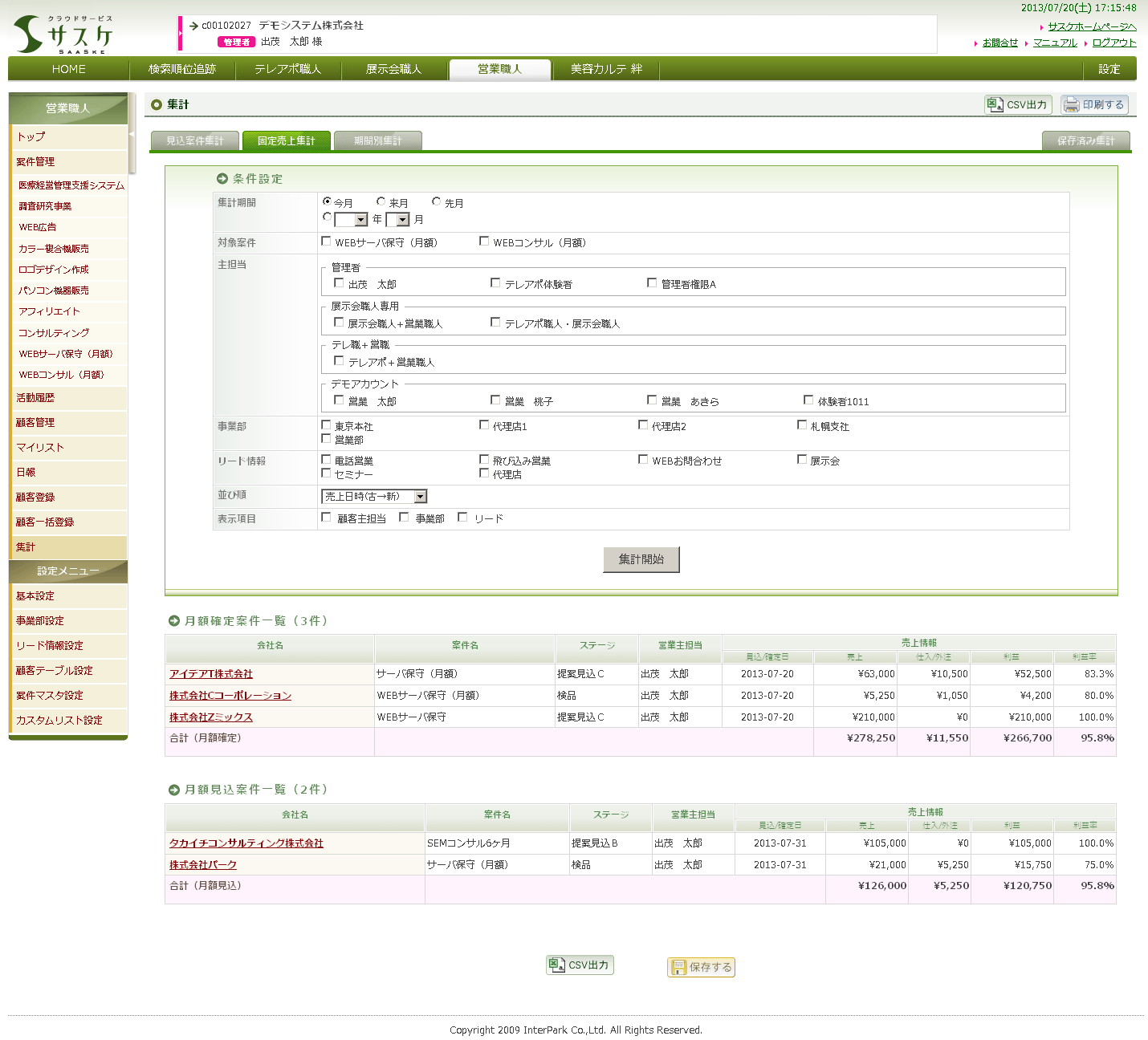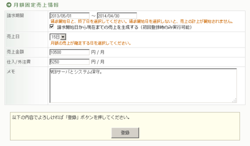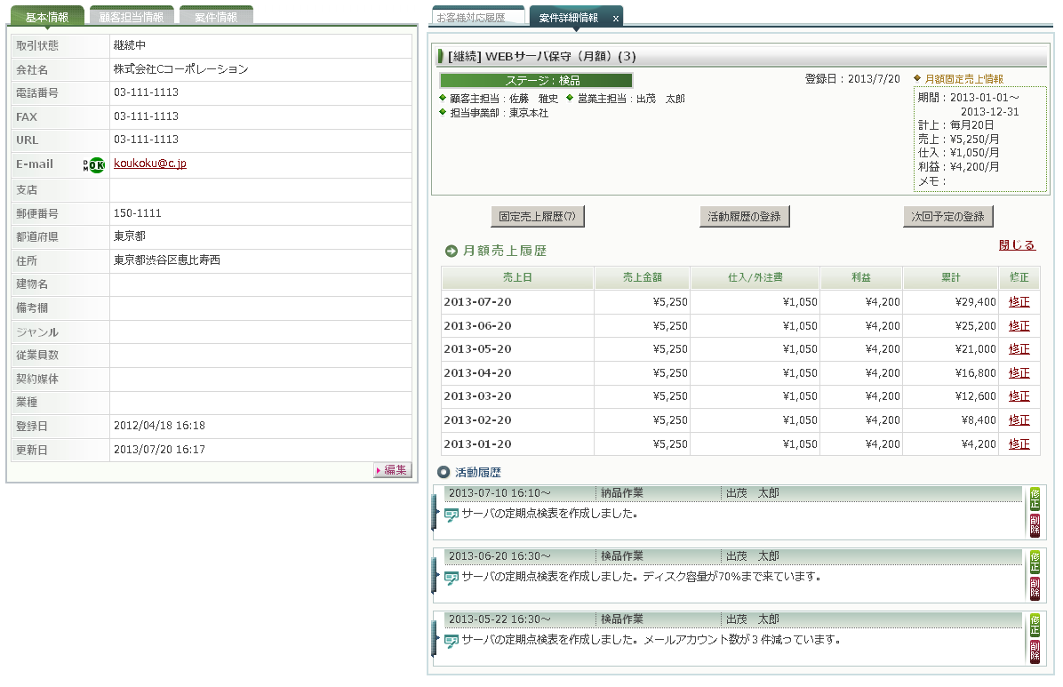 Sales 2013/07/22 【営業支援ツール-管理者向け(2)-】月額料金も簡単に売上管理できる! 営業職人の売上管理では、単発で発生する売上と毎月固定で発生する月額料金のどちらも管理することができます。月額の売上管理は、案件登録時に設定するだけで、契約期間満了時まで毎月自動的に売上が計上されるようになります。毎月、入力する手間も省け、さまざまな売上を一元管理できるようになります。登録した月額料金の売上情報は、集計機能の「固定売上集計」から集計結果を見ることができます。 ▲ 集計画面営業職人での月額料金の設定は、単発の売上案件と同様にまずは、[案件マスタ設定]で月額売上管理の案件マスタ情報を登録し、その後、対象企業にて案件の新規登録を行います。 ▲ 案件マスタ設定案件の新規登録では、月額料金が発生する「請求期間」、月額料金を計上する「売上日」、月・z料金を入力します。案件を登録する以前から発生している月額料金については、設定した過去の開始日まで遡り売上を生成することも可能です。 ▲ 新規案件登録また、特定期間のみ割引などで金額が変わる場合は、「固定売上履歴」から対象月の月額料金を編集できるので、キャンペーン等の特定月の料金変更にも柔軟に対応できます。 ▲ 対応履歴と月額売上履歴