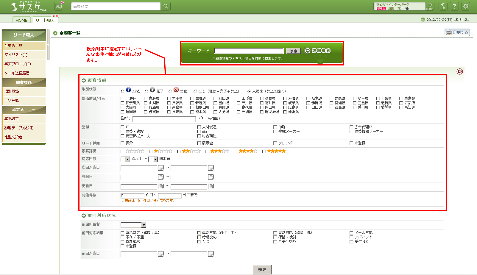 また、顧客情報として作成した項目を検索対象に追加すれば、詳細検索で都道府県や業種などを元に抽出することもできます。