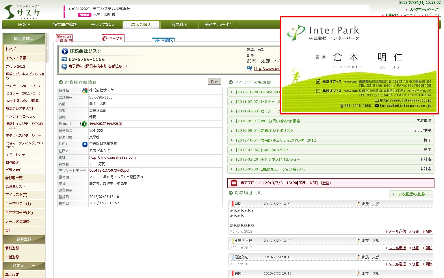 テレアポ職人/営業職人/展示会職人では、スキャナ等で名刺の画像を取り込んで名刺管理ソフトとしても使うことができます。会社名や名前番号の一部だけも検索できるので素早く目的の顧客を見つけ出すことができます。
