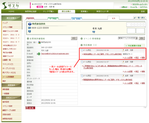 また、メール送信がエラーになった顧客の対応履歴欄には「配信エラー」と表示されます。