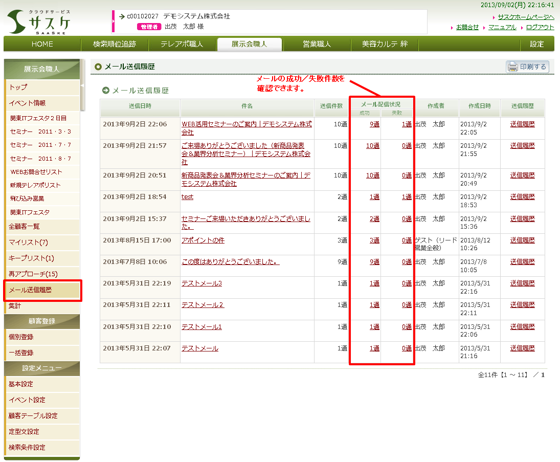 メール送信の成功及び失敗は、メール送信履歴画面の「メール配信状況」からその件数を確認できます。件数をクリックすると、対象の顧客一覧が表示されます。