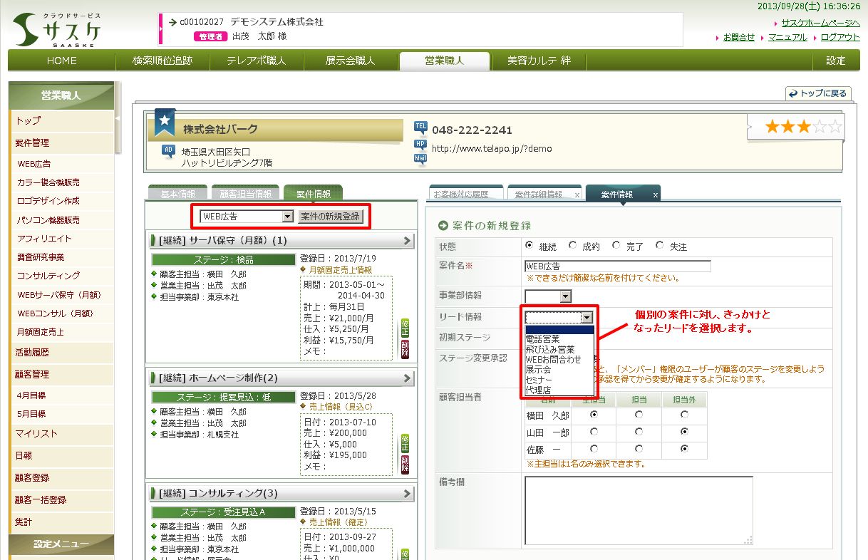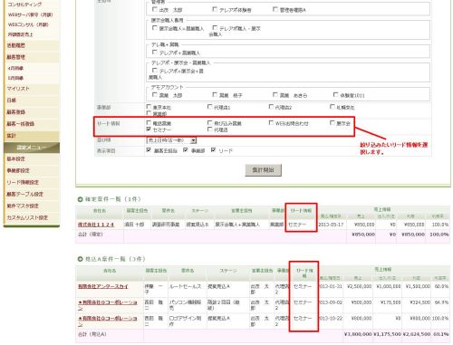 営業職人では、案件化のきっかけとなったリード情報(営業活動やアプローチ方法)を設定することで、リード別の売上集計やリードで絞った案件の一覧を作成することができます。テレアポや展示会などからどれくらいの成果があったかなどを振り返ることができるようになります。