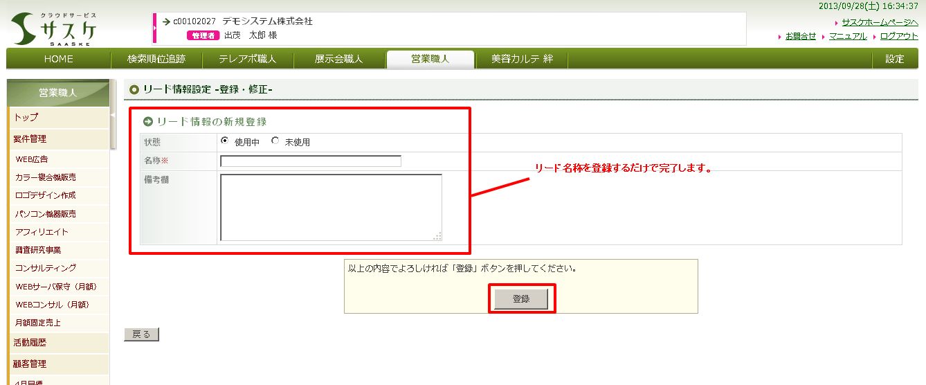 リード情報設定画面で「新規登録」ボタンをクリックすると、下記のリード情報新規登録画面が表示されますので、リード名称を入力し登録します。