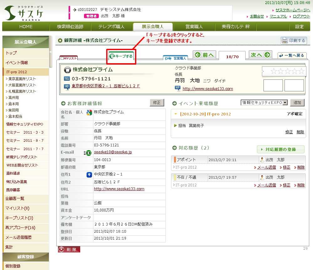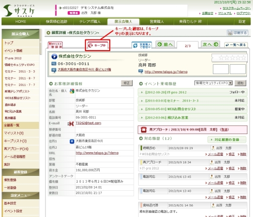 キープ登録は、顧客詳細画面で「キープする」をクリックすると、登録することができます。あらかじめ設定された日数の期間、他のアカウントから対象の顧客情報が見れなくなります。
