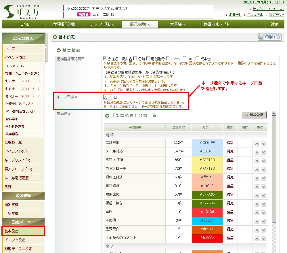 キープの日数は、基本設定から設定します。(全アカウント共通の設定になります)