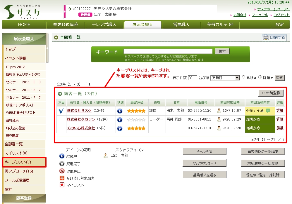 また、自分がキープした顧客の一覧は、「キープリスト」から参照することができます。