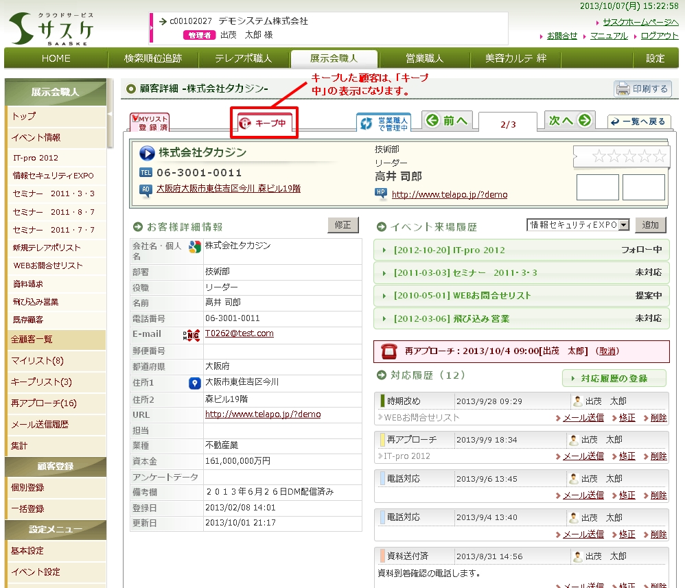展示会職人では、自分がフォローすると決めた見込み客を他のアカウントから見れなくすることができる「キープ機能」というものがあります。大人数でフォローしていたり、離れた拠点間で顧客情報を共有している場合に、他の人が誤ってフォローすることを防止することができます。