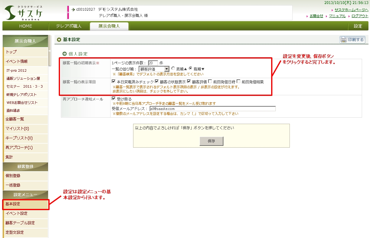 設定は、「基本設定」から行うことができます。ここでは1ページに表示する件数や並び順のルールを設定することができます。その他、「前回発信結果」など一部の項目の表示/非表示を設定することができます。