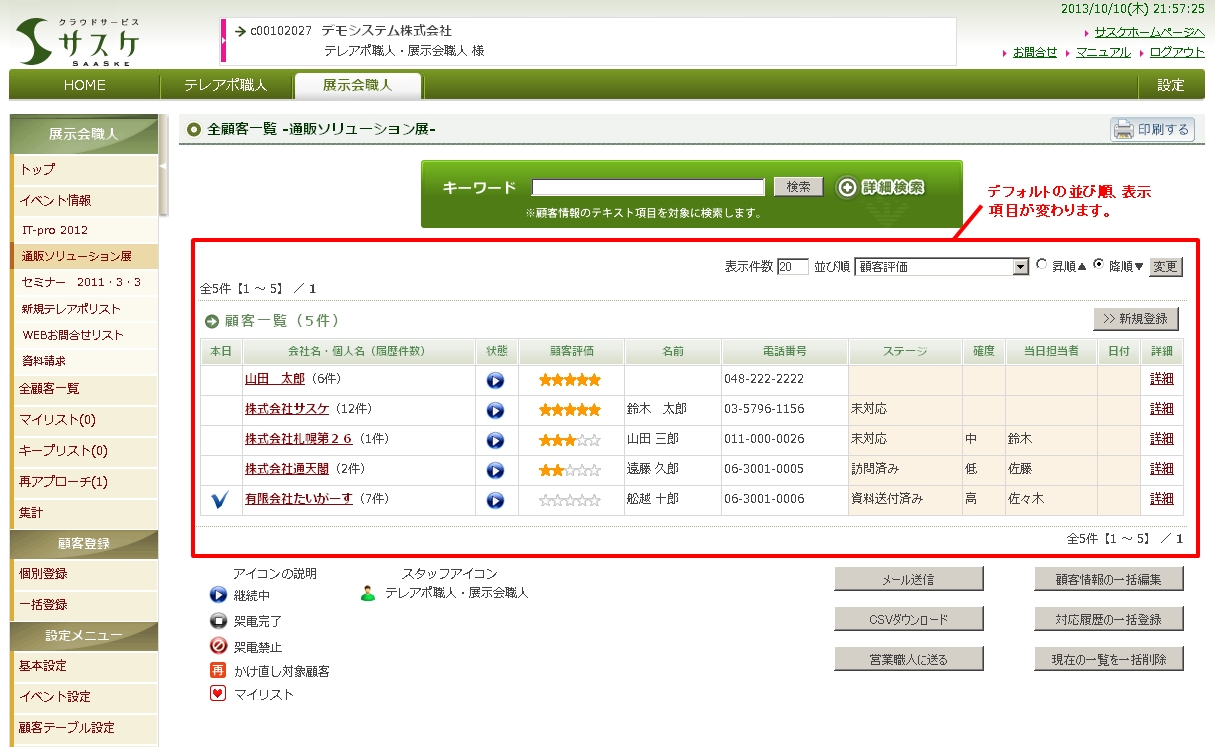 展示会職人の検索結果などで表示される顧客一覧の一部の表示項目やデフォルトの並び順を自分自身用にカスタマイズすることができます。顧客テーブル設定画面から設定した内容は共通ですが、自分用に顧客一覧を見やすくする際に便利です。