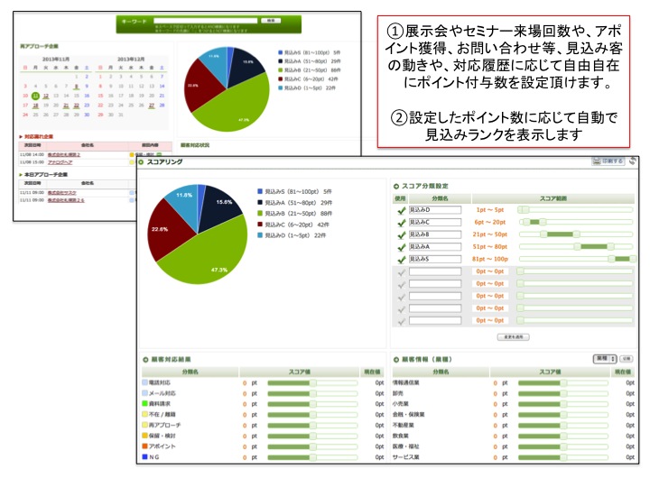 1、展示会やセミナー来場回数や、アポイント獲得、お問い合わせ等、見込み客の動きや、対応履歴に応じて自由自在にポイント付与数を設定頂けます。