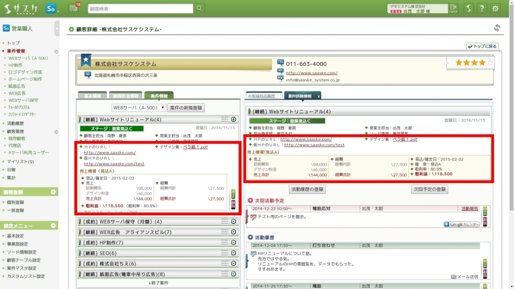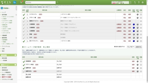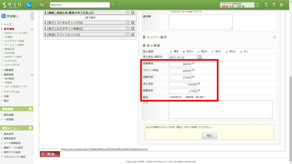 「売上」「経費」「粗利」の管理が行えるようになりました。「売上」「経費」に関しては内訳を2つまで設定することが可能です(売上合計、経費合計は内訳から自動計算されます)。また、売上と経費から「粗利率」「粗利益」が自動計算されます。