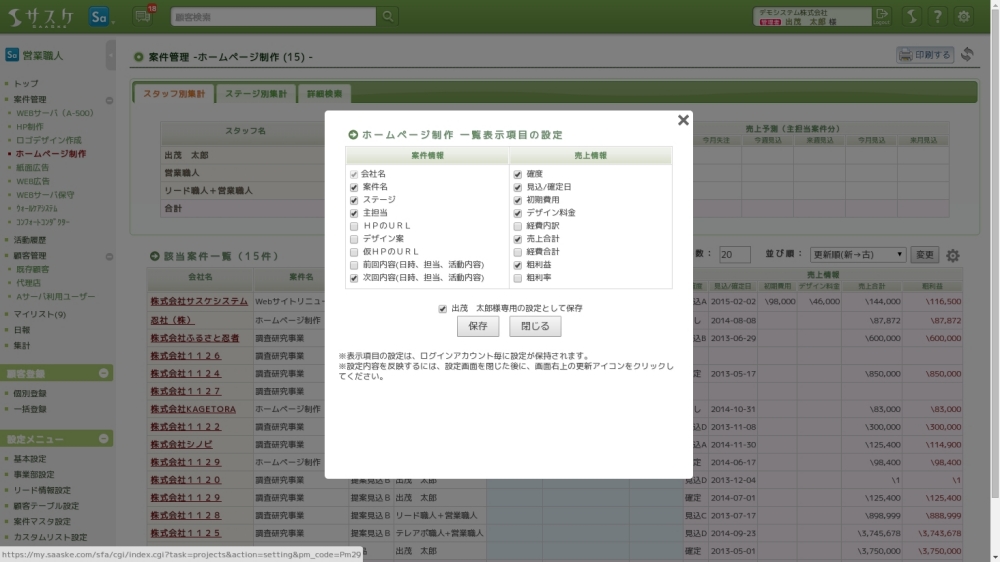 一覧表の右上にある歯車から「一覧表示項目の設定」が可能です。「○○専用の設定として保存」にチェックが入っていますと、個人の設定として保存可能です。チェックを外すと他の方にも同じ設定として上・曹ォ保存することができます(ユーザー権限の方も上書き保存することが可能です。ご注意下さい。)。