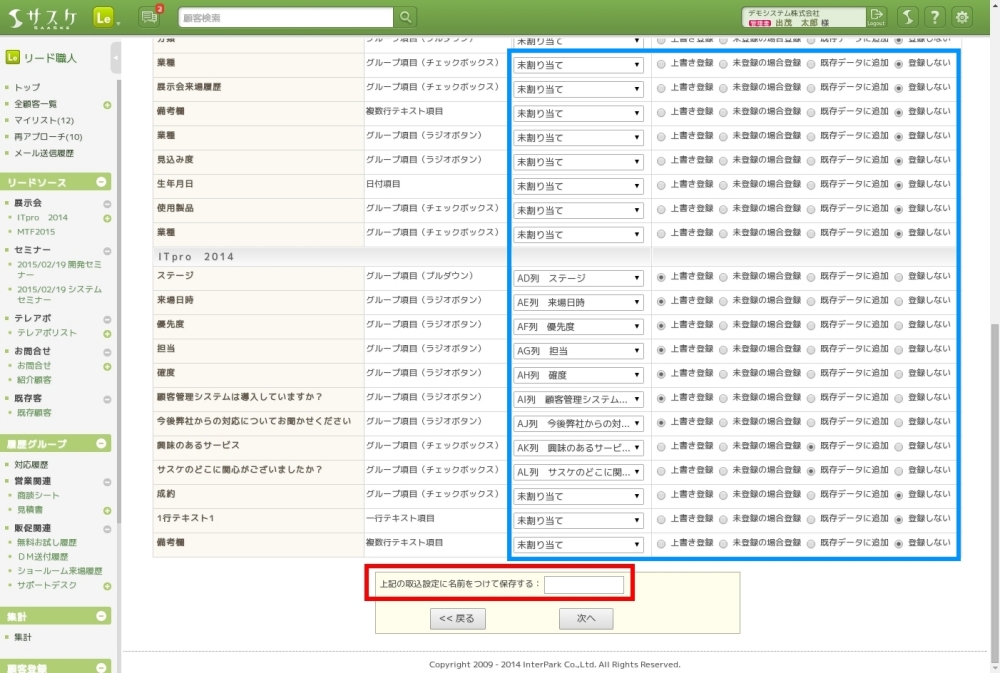【保存済み設定】を使うには、設定をまず行う必要があります。通常通りインポートの設定(項目の割り当て)を行ないます。画面下部に「上記の取込設定に名前をつけて保存する」の枠がありますので、ここで名前を入力し「次へ」をクリックすると【保存済み設定】が登録されます。