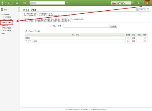 グループの確認は、サスケの右上にある「歯車」マークをクリックしし左メニューの「グループ設定」をクリックすると「グループ設定」画面へ遷移します。ここでは、現在作成しているグループの確認画面が出てきます。まだグループ設定していない場合は、・Oループの追加のみ出来る状態です。