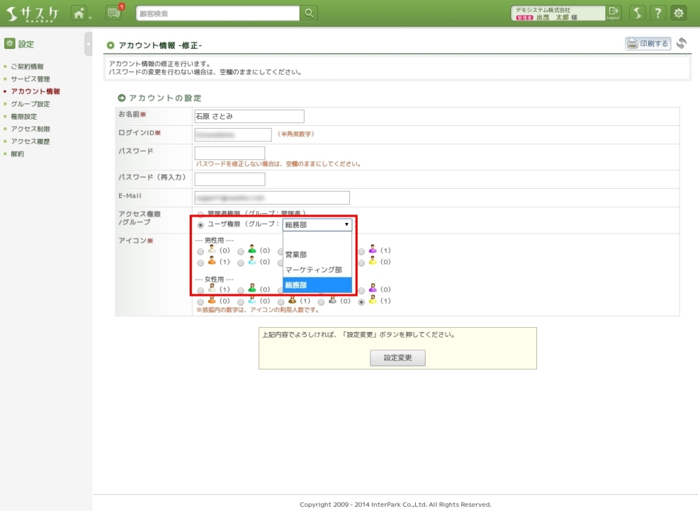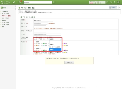 追加したグループをアカウントと紐付けることで、グループ分けが完了します。「アカウント情報」へ移動し、グループへ追加したいアカウントの右側にある「修正」をクリックします。修正画面で「アクセス権限/グループ」のグループプルダウンから選択し、登録します。このアカウントの修正については「サスケのアカウント情報の追加・編集」をご参考下さい。
