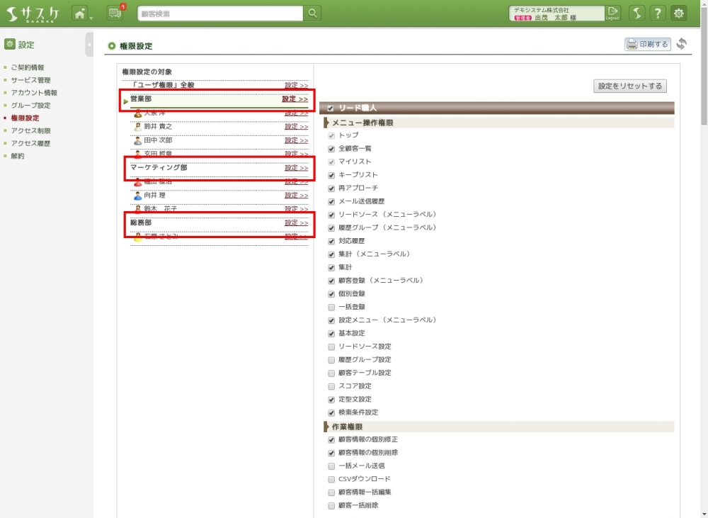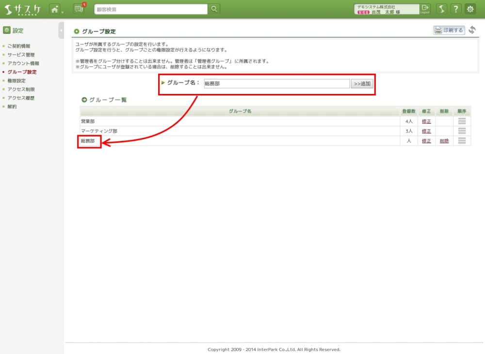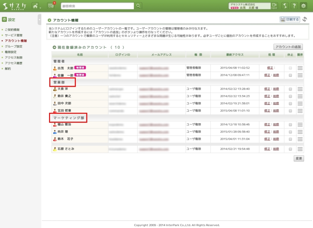アカウントが増えてきたり、各部署でサスケを利用していると、把握しづらくなります。今回は、グループ機能を活用して、アカウントの整理を行いましょう。