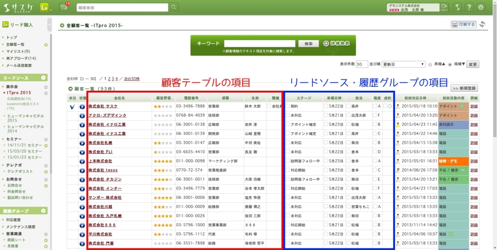顧客一覧で表示されている情報・項目は「顧客テーブルの項目」と「リードソース(イベント情報) もしくは 履歴グループの項目」となっています。例えば「リードソース」から顧客一覧を表示させた場合は、左側には顧客テーブルの項目。右側にはリードソースの項目が表示される仕様となっています。