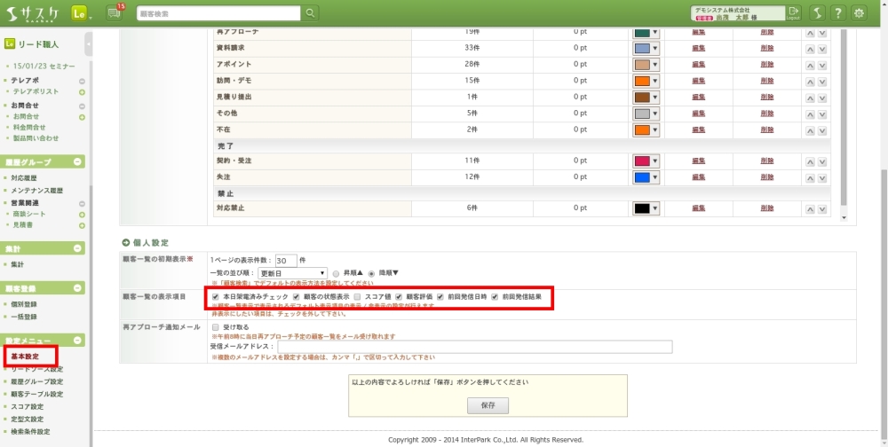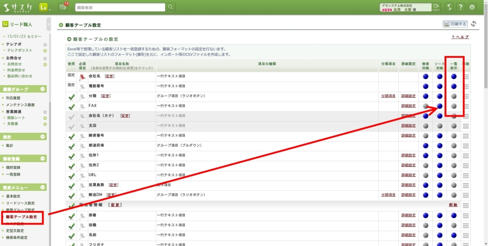 「顧客テーブル設定」や「リードソース設定」へ移動します。各項目の「一覧表示」に青色で印を付けた項目が、対象に出来ます。