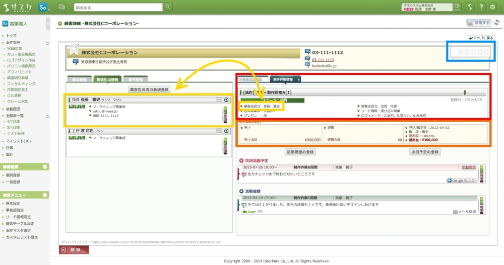 顧客に対する取引状態です。「継続中」「完了」「禁止」の3種類があります。 - 顧客評価(0〜5)