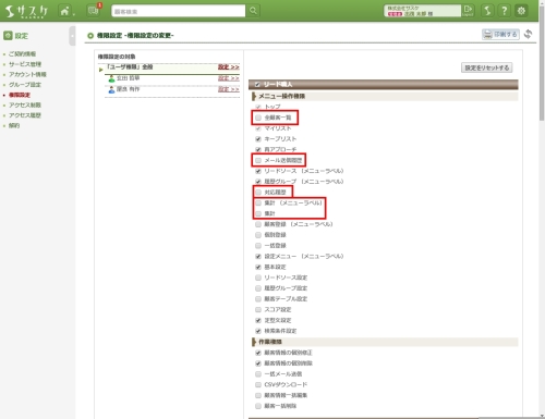右上の歯車から設定画面へ移動し、権限設定をクリックします。