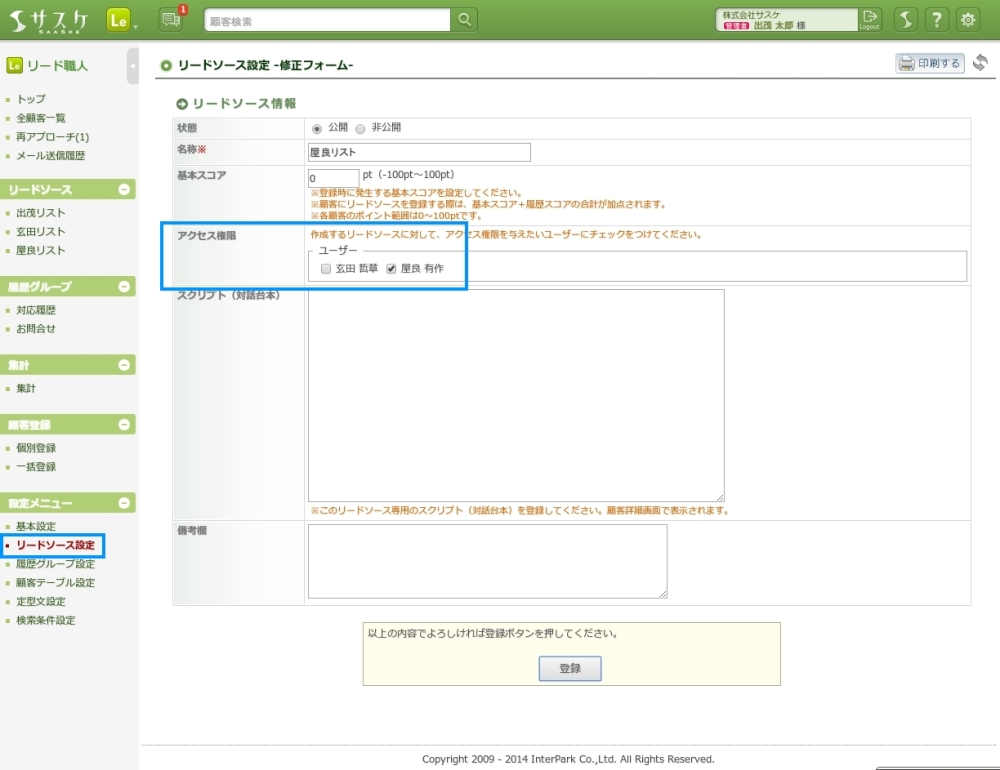 左メニューのリードソース設定へ移動し、表示・非表示の設定したいリードソースの「修正」をクリックします。