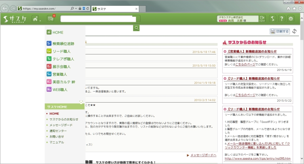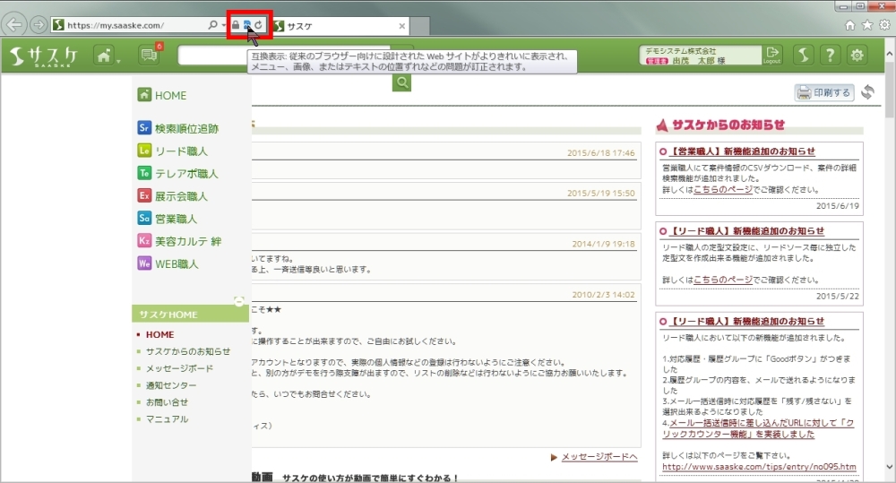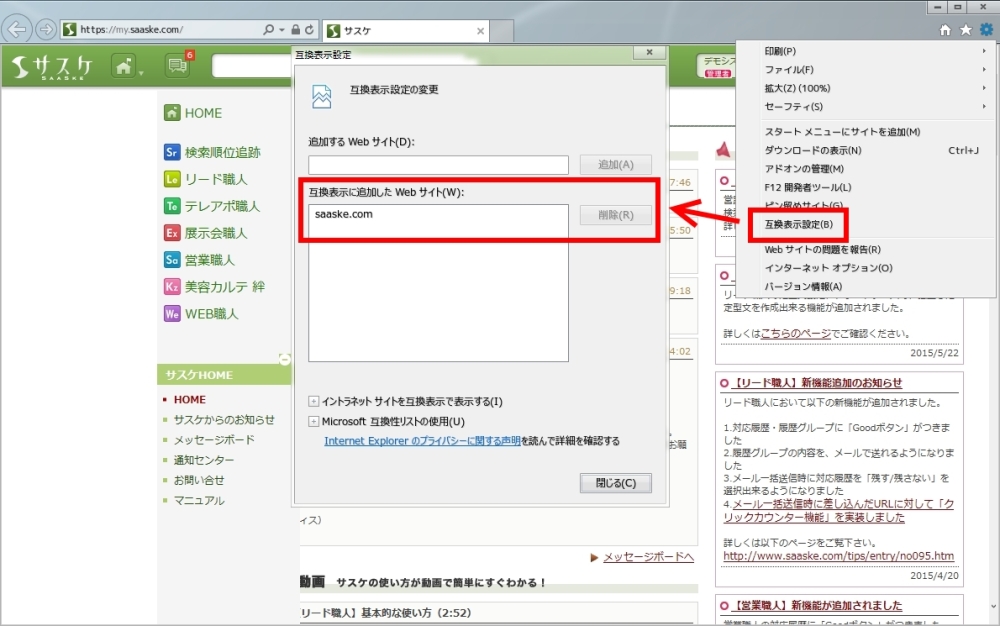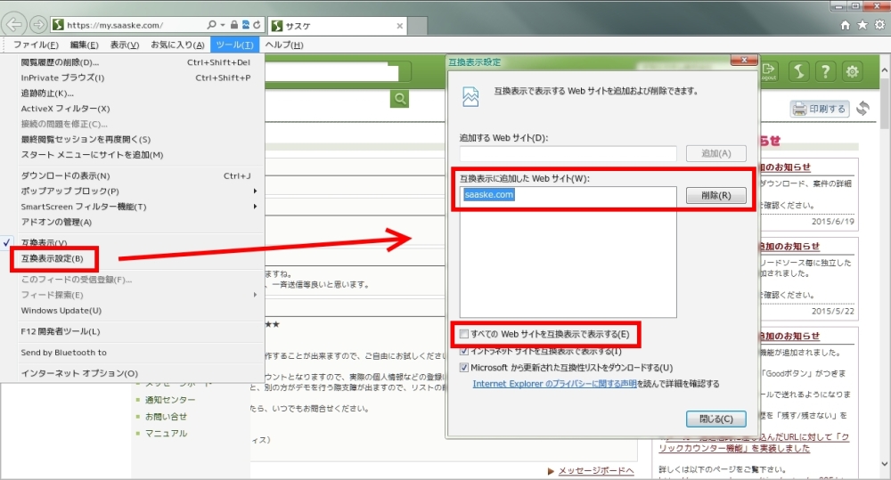 このメニュー内に「ツール」があり、ここから「互換表示設定」を選択してください。開いたウィンドウに「互換表示に追加したWebサイト」に "saaske.com" がある場合は削除をします。また下部の「すべてのWebサイトを互換表示で表示する」にチェックがある場合はチェックを外して下さい。