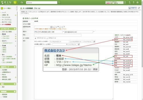 サスケのデフォルトにて作成された項目については「メール送信の変換キー」にて確認することは出来ます。