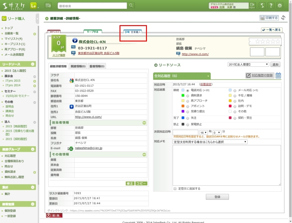 営業職人へ登録後の「顧客担当情報」について