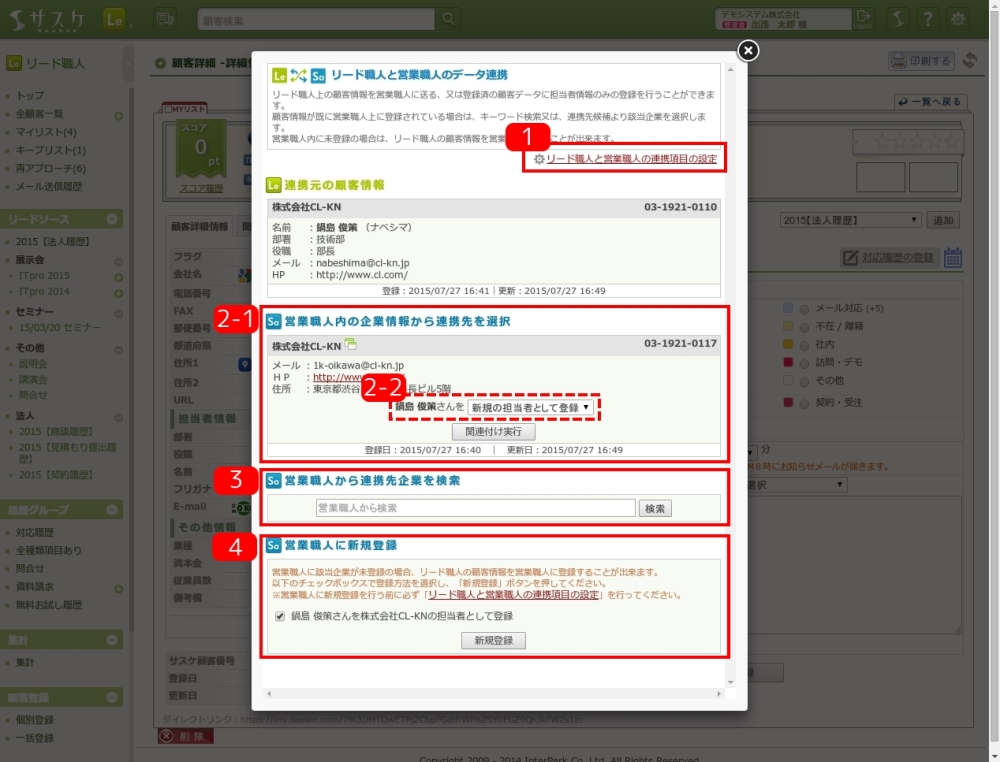 ※こちらの機能は顧客情報を「連携する(関連づける)」だけで、「担当者情報のデータ移行及び、上書登録」はされません。