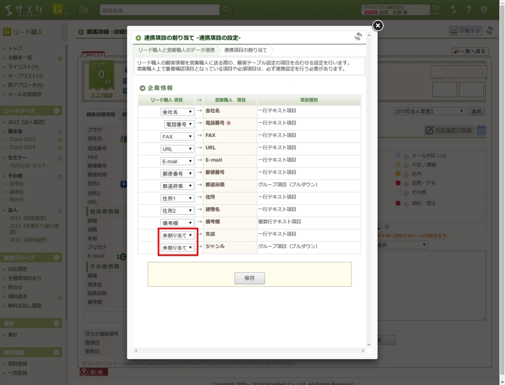 ここからリード職人と営業職人の項目の割り当て設定を行えます。左側がリード職人の項目、右側が営業職人の項目となっています。