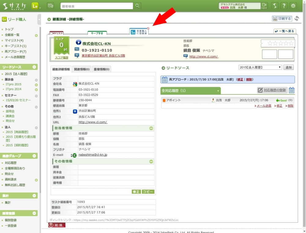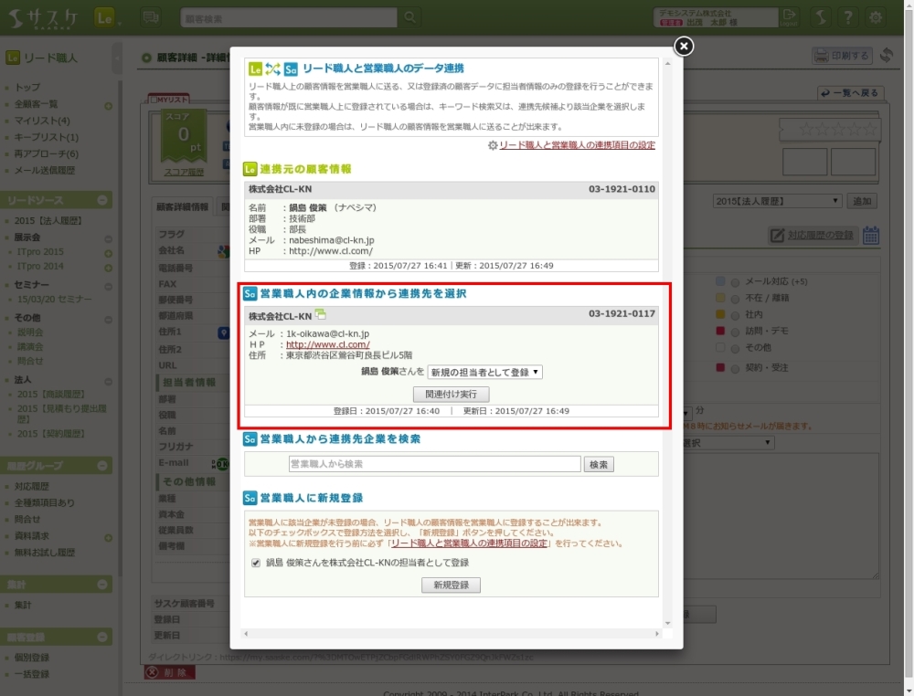 以前は営業職人上部の「リード職人から登録」タブの機能で、営業職人へ移行してきた顧客データのみ、リード職人のデータと連携され(関連づけされ)ていました。