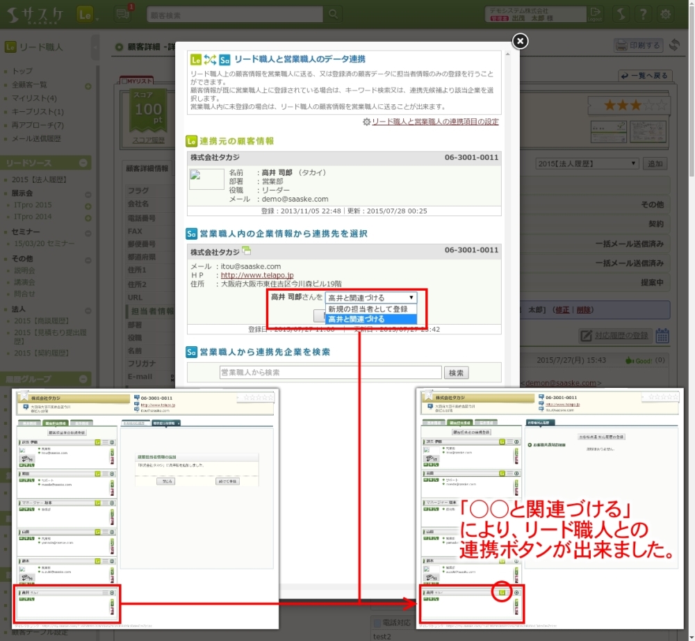 いままで通り「営業職人へ送る」ボタンをクリックすると、画像のように「リード職人と営業職人のデータ連携」というウィンドウが出てきます。