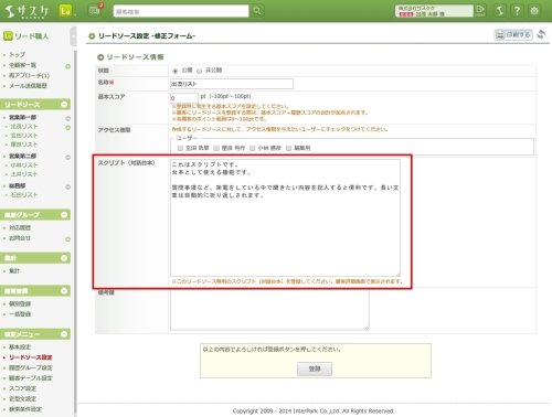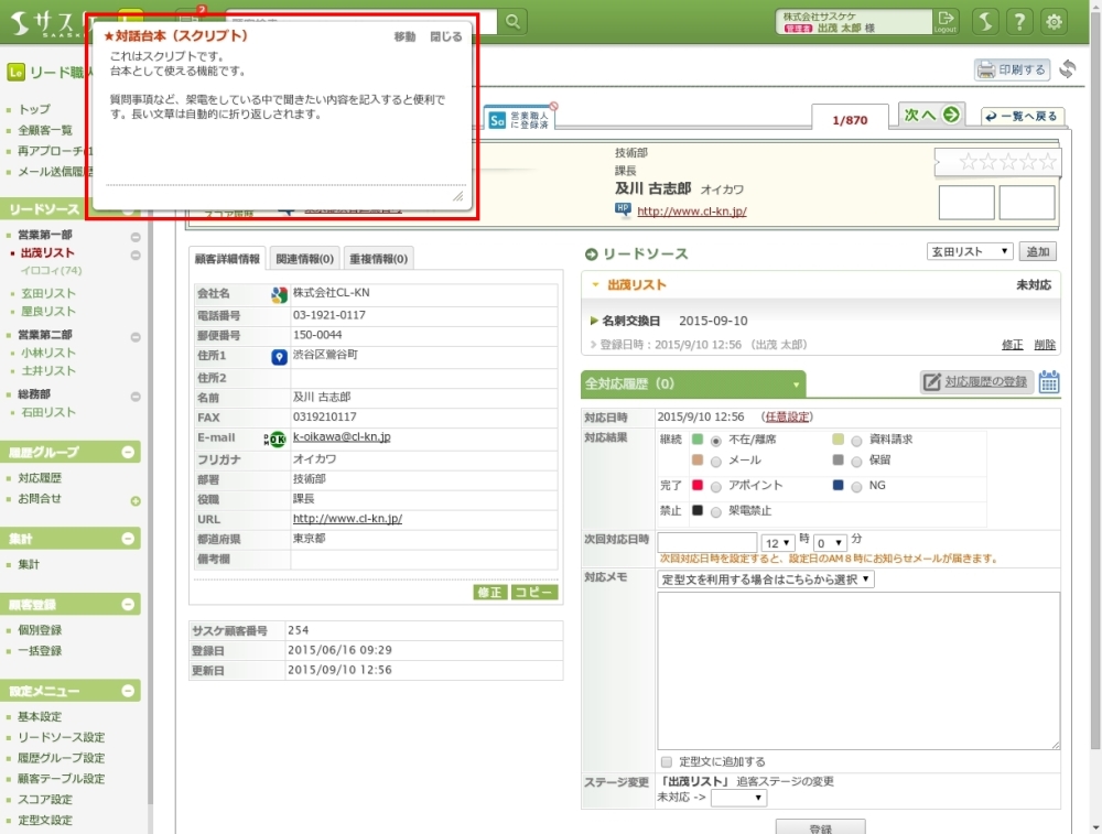 顧客へのテレアポを行う際のスクリプトを保存できる機能となっています。