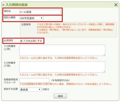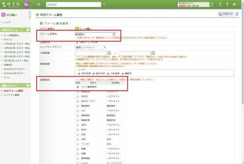 するとWEBフォーム基本設定が開きますので名称を入力し、連携項目を「サスケ顧客番号」以外チェック外して登録をします。