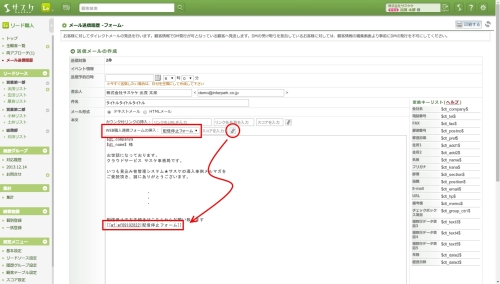 連携Webフォームの挿入」からフォームを選択し、その横にあるチェーンのアイコンをクリックすると本文へ挿入することができます。