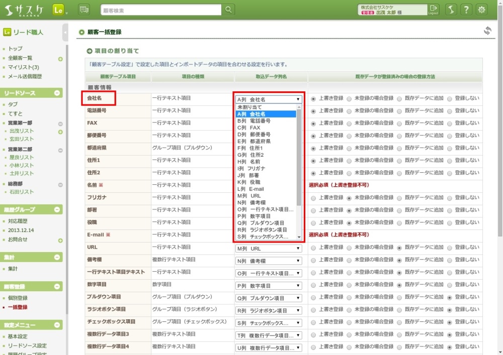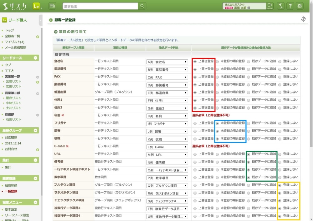 上書き登録を選ぶと、元々サスケに入っているデータを全て「エクセルのデータで上書きする設定」となっています。