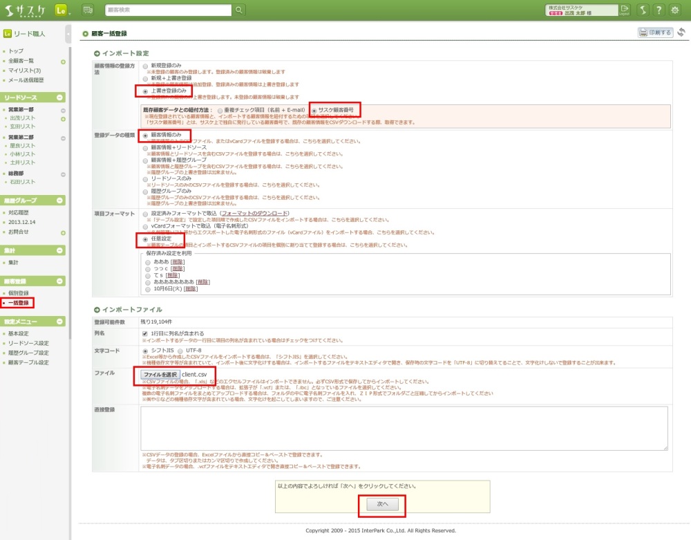 「一括登録」画面へ移動し、以下の設定を行います。