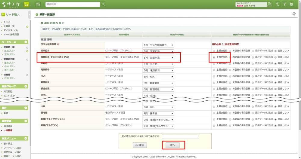 今回、情報をインポートしたい項目「営業担当(チェックボックス)」の取込データ列名を「営業担当」へ割り当てます。そして、右側の「既存データが登録済みの場合の登録方法」を「上書き登録」へ設定します。
