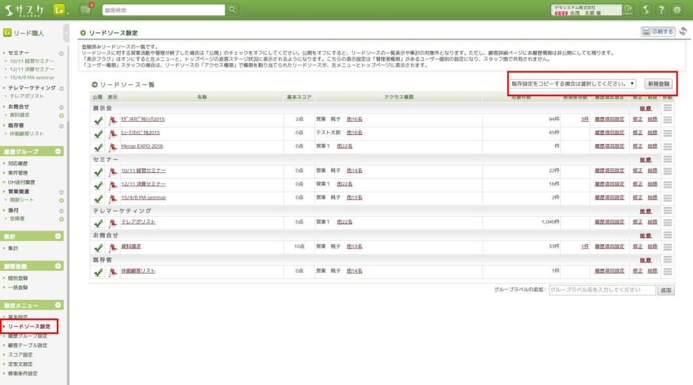 こちらは「イベント情報(例えば展示会やセミナー)」、「テレアポのリスト」などの、どこでこの顧客と出会ったかの“流入経路・接点履歴”を管理する場所となっております。例えば、デモでは以下のように「展示会のリードソース」「セミナーのリードソース」そして「テレアポのリードソース」が登録されています。