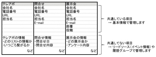 こちらは「問合せ」など、リードソースとは違い“幾度も履歴を残す可能性がある情報”を登録する箇所になっています。対応履歴の別テーブルのような使い方が可能です。