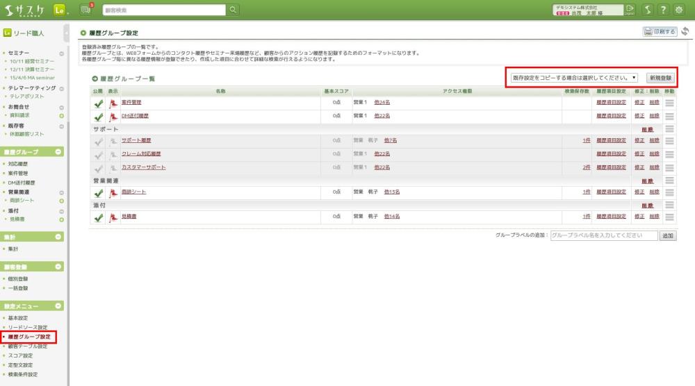 サスケで項目を作成する際「顧客テーブル」「リードソース(イベント情報)」「履歴グループ」、どこで項目を作ったらいいのか?と疑問になることがあります。本日は、その中の一つ「履歴グループ」について解説いたします。