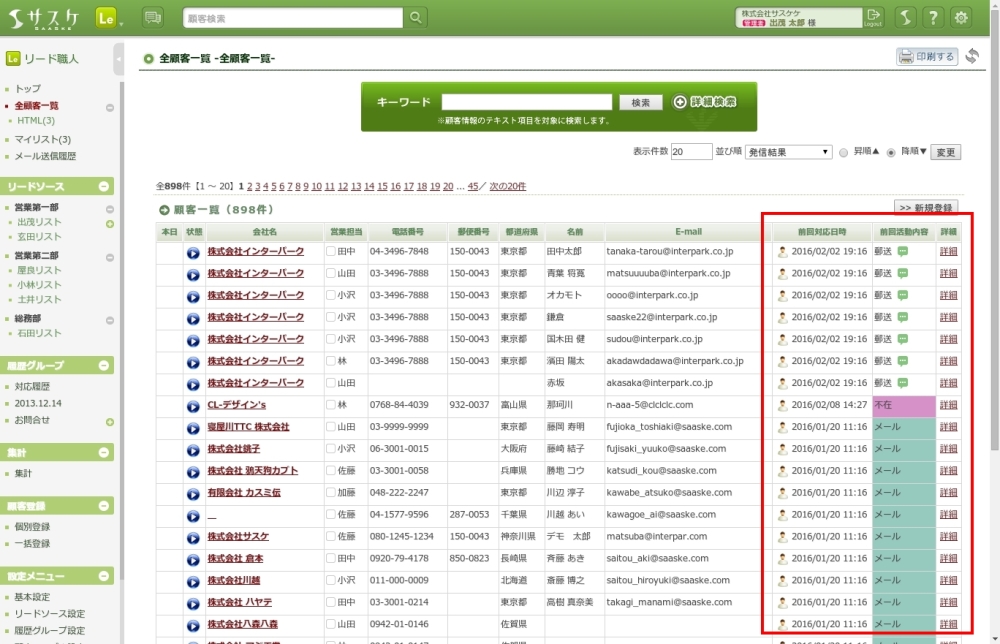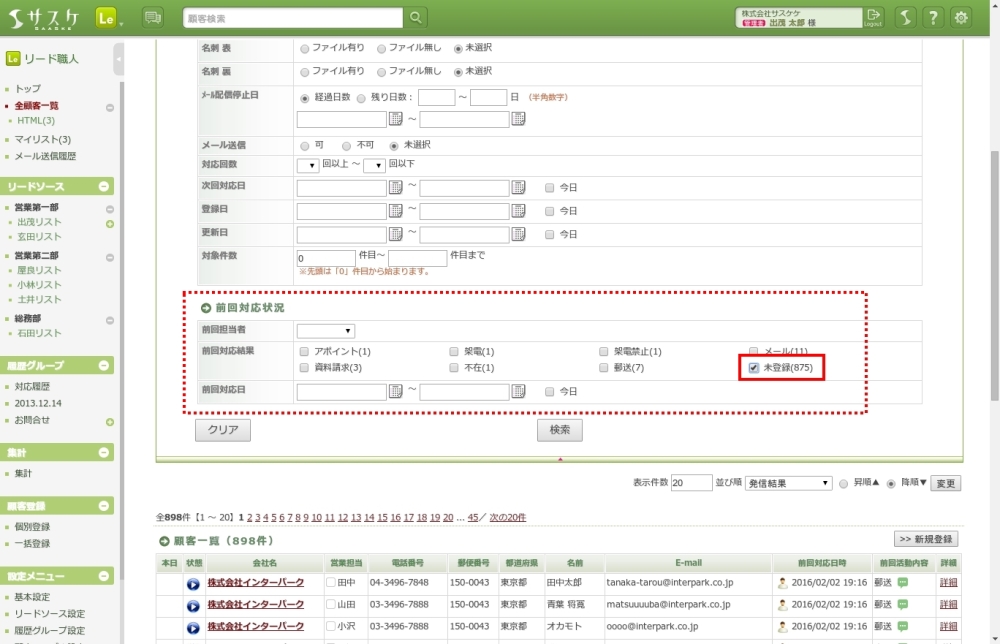 対応履歴・架電履歴を登録していない顧客を検索するには、「詳細検索」にて設定を行うことが出来ます。詳細検索の「前回対応状況」に「前回対応結果:未対応」という項目がありますので、これにチェックを入れて検索をします。