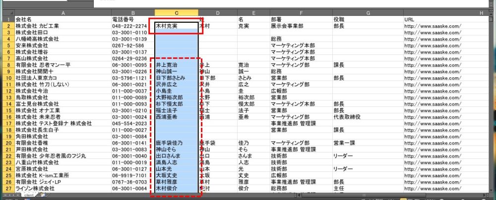 先ほどの操作で「姓名」をくっつけることが出来ました。しかし、「姓名」の間に半角のスペースが欲しい、と思うときもございます。その方法を下記記載していきます。