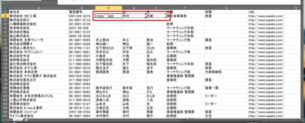 次に、新しい列にエクセルの関数を入力していきます。例えば画像のように、C2のセルに半角のイコール「=」を入力し、姓のセルをクリックします。次に半角のアンド「&」を入力し、名のセルをクリックします。すると、C2のセルに「=D2&E2」のような関数が入力されました。