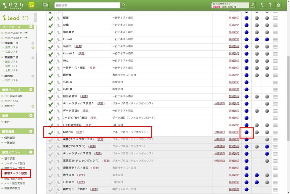 左メニューの「顧客テーブル設定」から仮で“配信NG”などという項目を作成します。このとき、項目の種類は「グループ項目」を選択します(プルダウン・ラジオボラン・チェックボックス、いずれでも大丈夫です)。