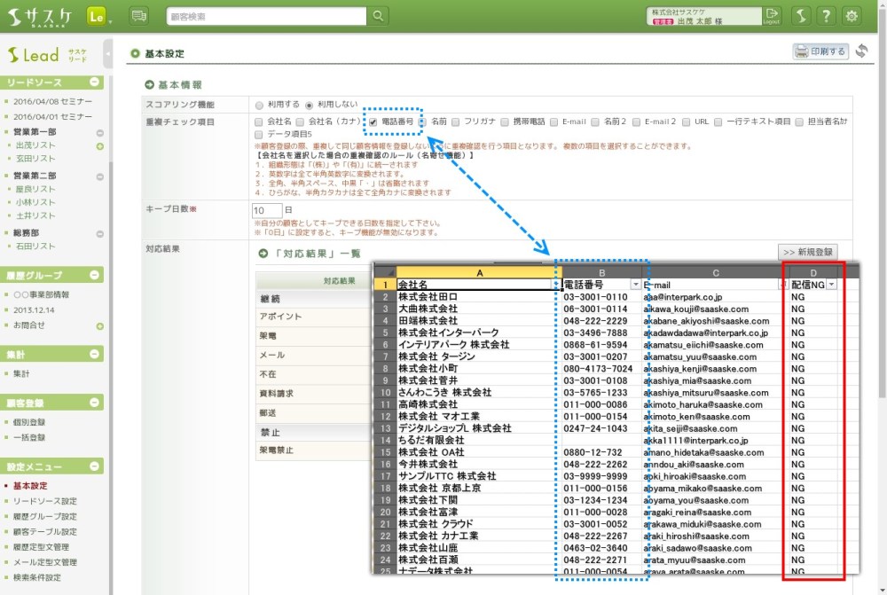 外部のシステムや、個々人が持っているリストであれば重複チェック項目に該当する項目(今回では電話番号)と、配信NGという列が入ったエクセルファイルを作成していただきます。