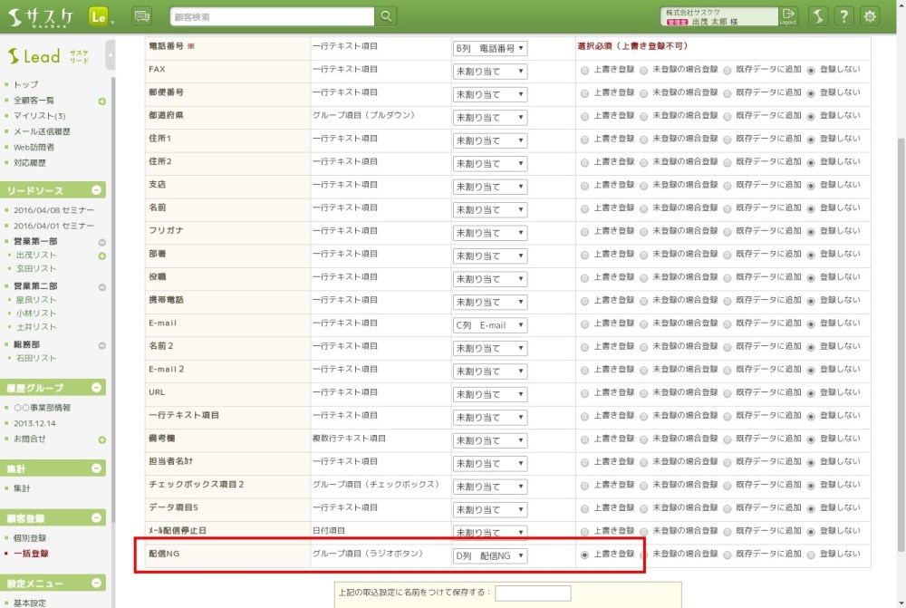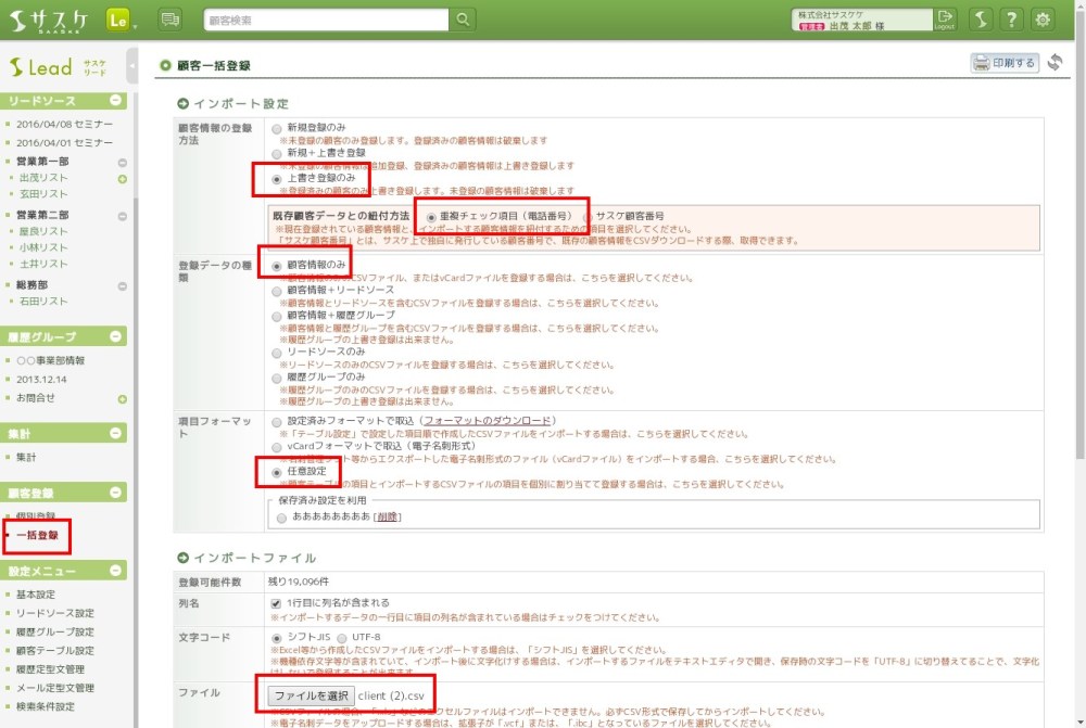 今回はサスケに登録されている顧客だけを登録しますので、画像のように上書き登録のみを選択します。紐づけ方法が出てきますので、該当する方(今回は重複チェック項目)を選択します。登録データの種類は顧客情報のみを選択し、項目フォーマットは任意設定を選択。