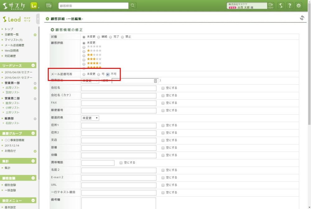 その中に「メール配信可否」という枠があり、こちらにて「不可」を選択して最下部の登録実行を行うと、完了します。