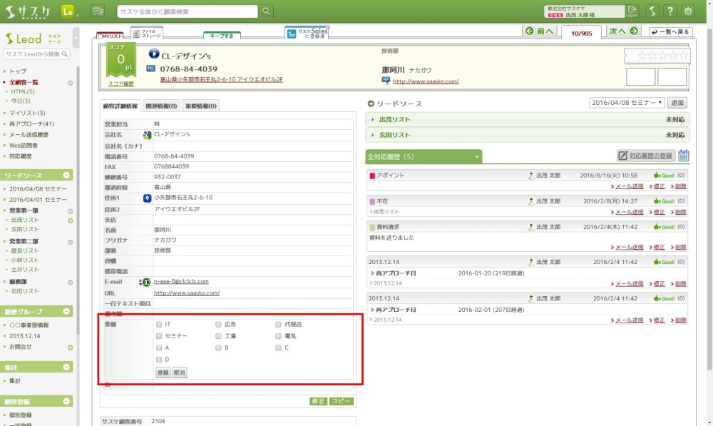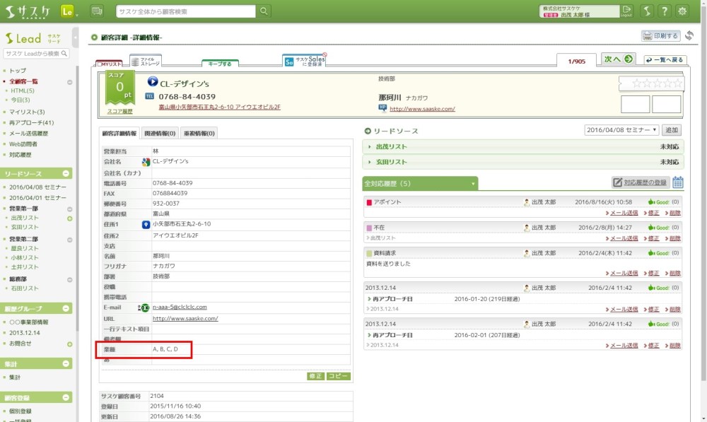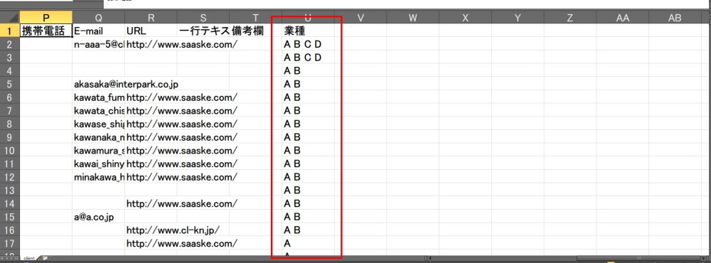 サスケへインポートするCSVデータをご用意し、該当項目(今回では業種)に対して「A B C D」とそれぞれスペースで区切ってデータを作成して頂きます。この状態でインポートすると、「A」「B」「C」「D」という複数の項目へレ点をつけることができます。